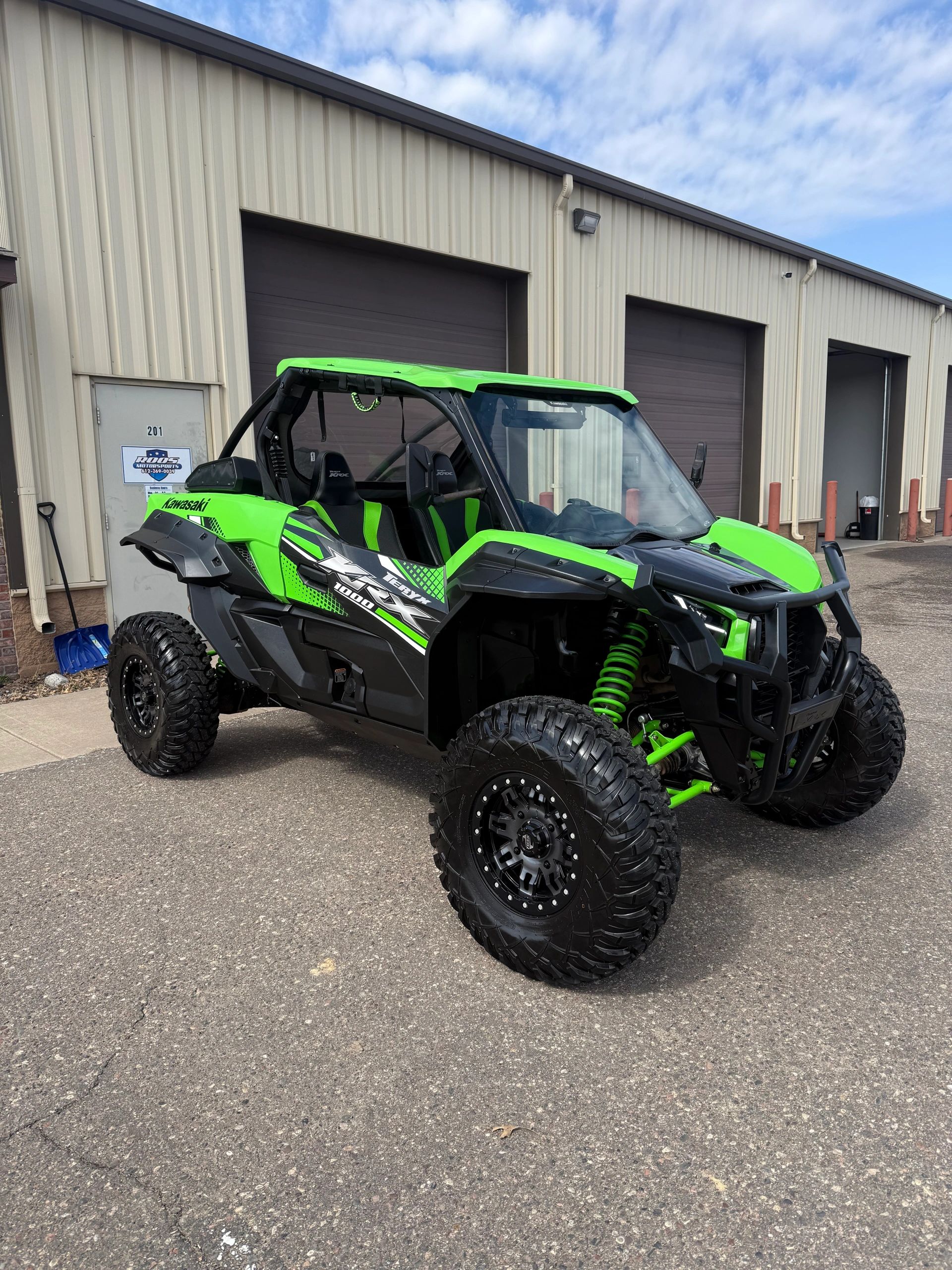 2021 Kawasaki KRX 1000 with power steering, roof, glass windshield, rear window, front and rear bumpers, turn signals, upgraded 32” wheels and 2293 miles. $13,999